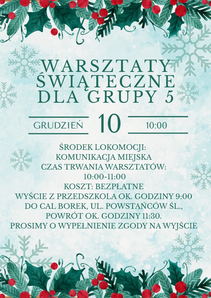 Szanowni Państwo W piątek 10 grudnia dzieci z grupy V odwiedzą Centrum Aktywności Lokalnej przy ulicy Powstańców Śląskich 210-218, gdzie będą uczestniczyć w warsztatach świątecznych. Zajęcia są bezpłatne. Na miejsce udamy się tramwajem. Wyjście z przedszkola około godziny 9:30. Planowany powrót około godziny 11:30. Serdecznie prosimy Państwa o rozmowy z pociechami na temat bezpiecznego zachowania się w środkach komunikacji publicznej. Prosimy również …