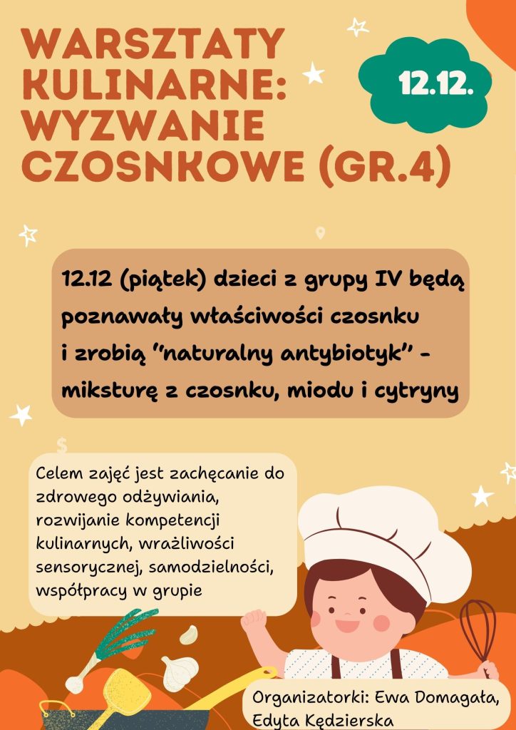 12.12.25 (piątek) dzieci z IV grupy na kolejnych warsztatach kulinarnych będą poznawały wszystkimi zmysłami