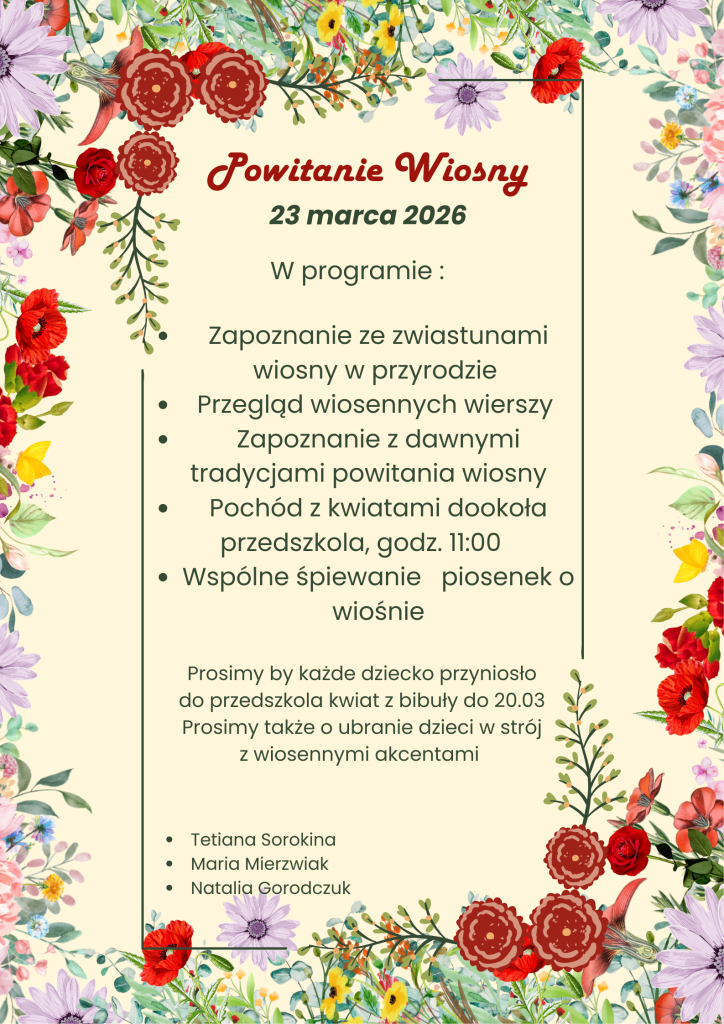 W poniedziałek 23.03.2026 będziemy uroczyście świętować pierwszy dzień wiosny w naszym Przedszkolu. Planujemy  wspólne śpiewanie wiosennych piosenek, przegląd wiosennych wierszy przygotowanych przez grupy oraz radosny  pochód dookoła przedszkola. Dzieci dowiedzą się jakie są pierwsze zwiastuny wiosny oraz poznają dawne tradycje witania wiosny m.in każda grupa przygotuje ludową,  wiosenna dekorację" gaik".   Z tej okazji prosimy Państwa o …
