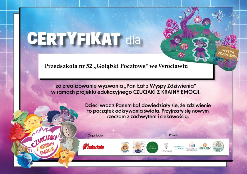 W ramach projektu „Czuciaki z Krainy Emocji” dzieci wyruszyły dziś w kolejną podróż po świecie uczuć i odkrywały, czym jest zdziwienie oraz zaskoczenie. Towarzyszył nam w tym niezwykły bohater – Pan Łał z Wyspy Zdziwienia, który pomógł przedszkolakom lepiej zrozumieć to niecodzienne uczucie.